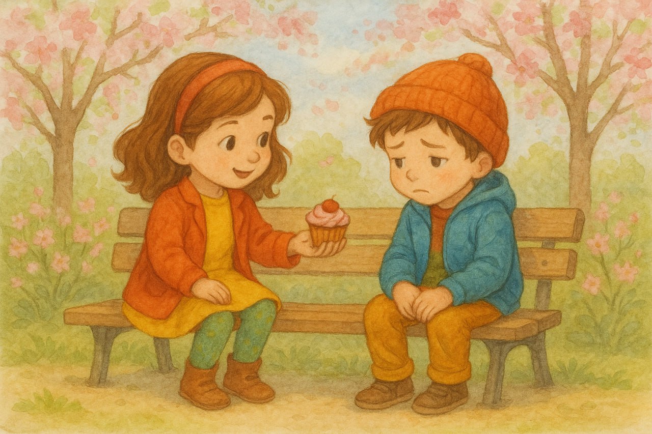 Вот ещё несколько примеров промптов: «Девочка отдаёт своё пирожное грустному другу на скамейке в парке. Весна, цветущие деревья, дети в яркой одежде. Стиль – сказочный акварельный».