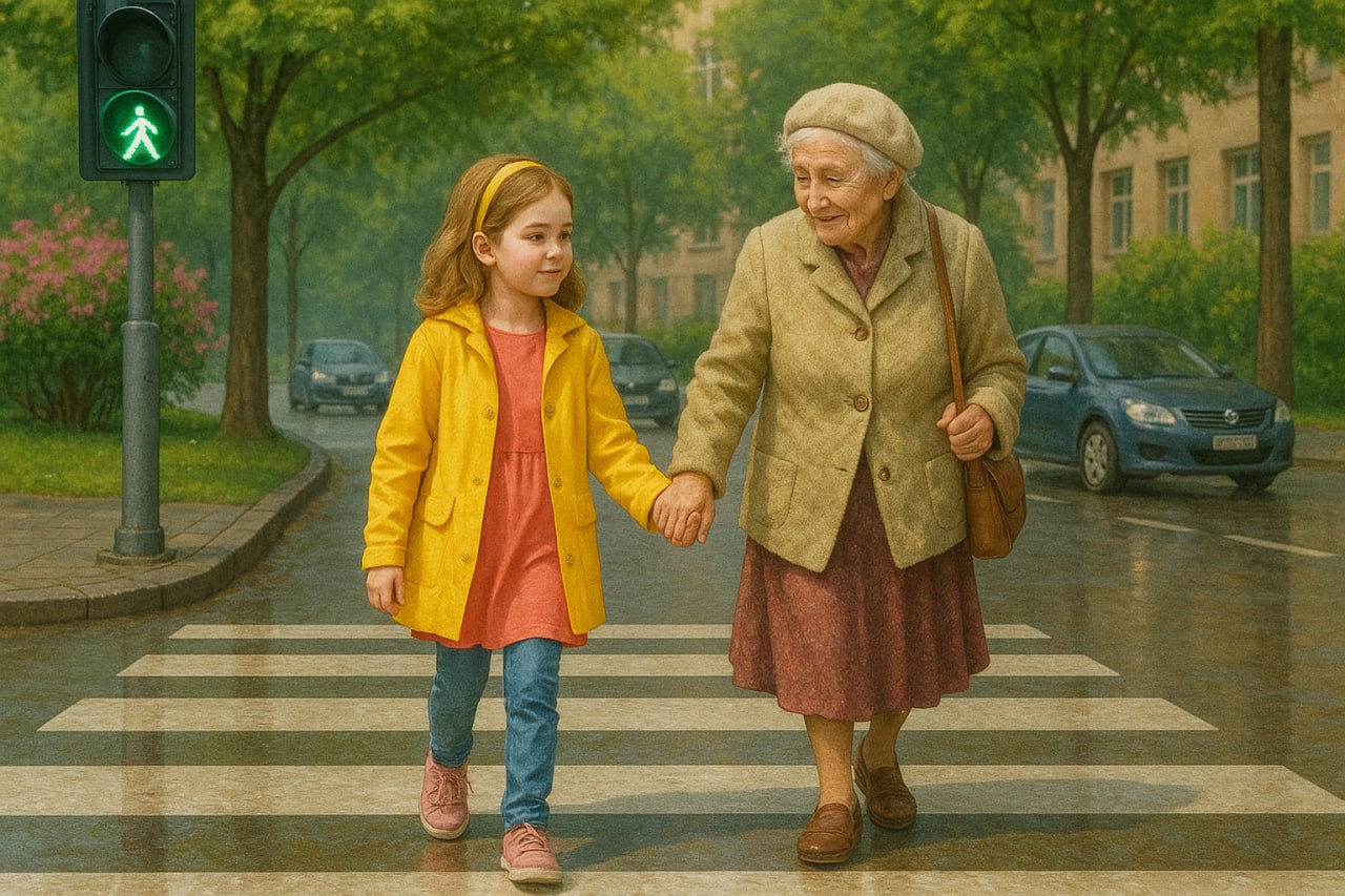 «Милая девочка 9 лет держит за руку пожилую бабушку. Они переходят дорогу по пешеходному переходу на зелёный свет светофора. Машины стоят, уступая им. Весенний городской пейзаж: асфальт мокрый после дождя, зелёные деревья, цветущие кусты. Одежда героев яркая и повседневная. Стиль – фотореализм, горизонтальный формат».
