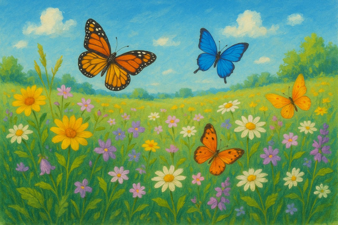 «Летний пейзаж с полем диких цветов: ромашки, васильки, лютики. Над полем летают бабочки – оранжевые, синие и жёлтые. Голубое небо с лёгкими облаками. Атмосфера – светлая, добрая, сказочная. Стиль – традиционная живопись».