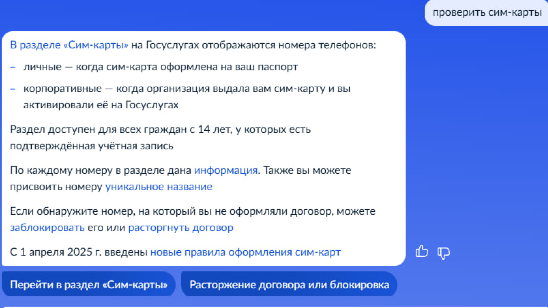 Если у вас не получилось найти раздел «Сим-карты на Госуслугах» по нашей инструкции, задайте вопрос роботу. Он даст прямую ссылку.