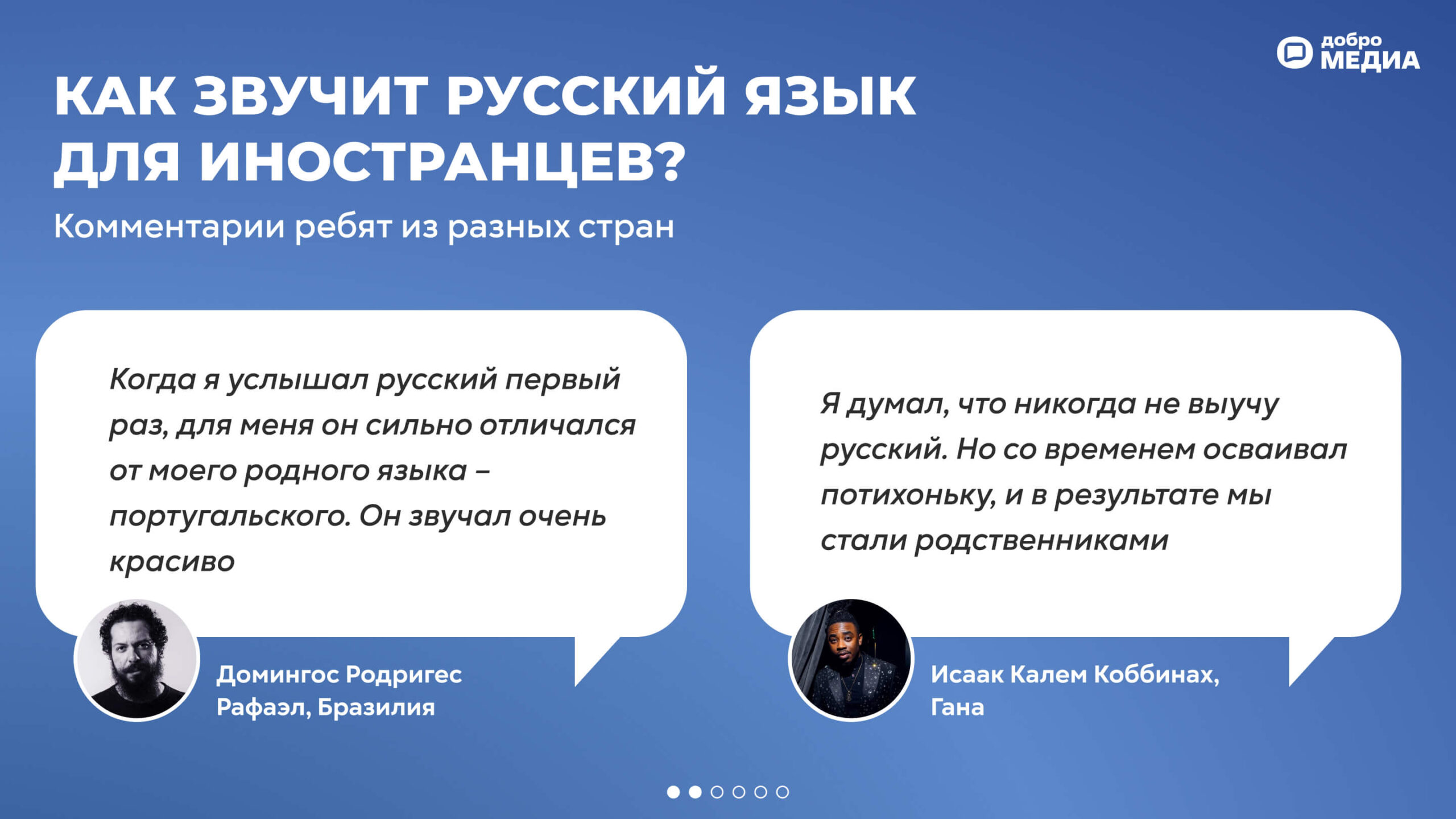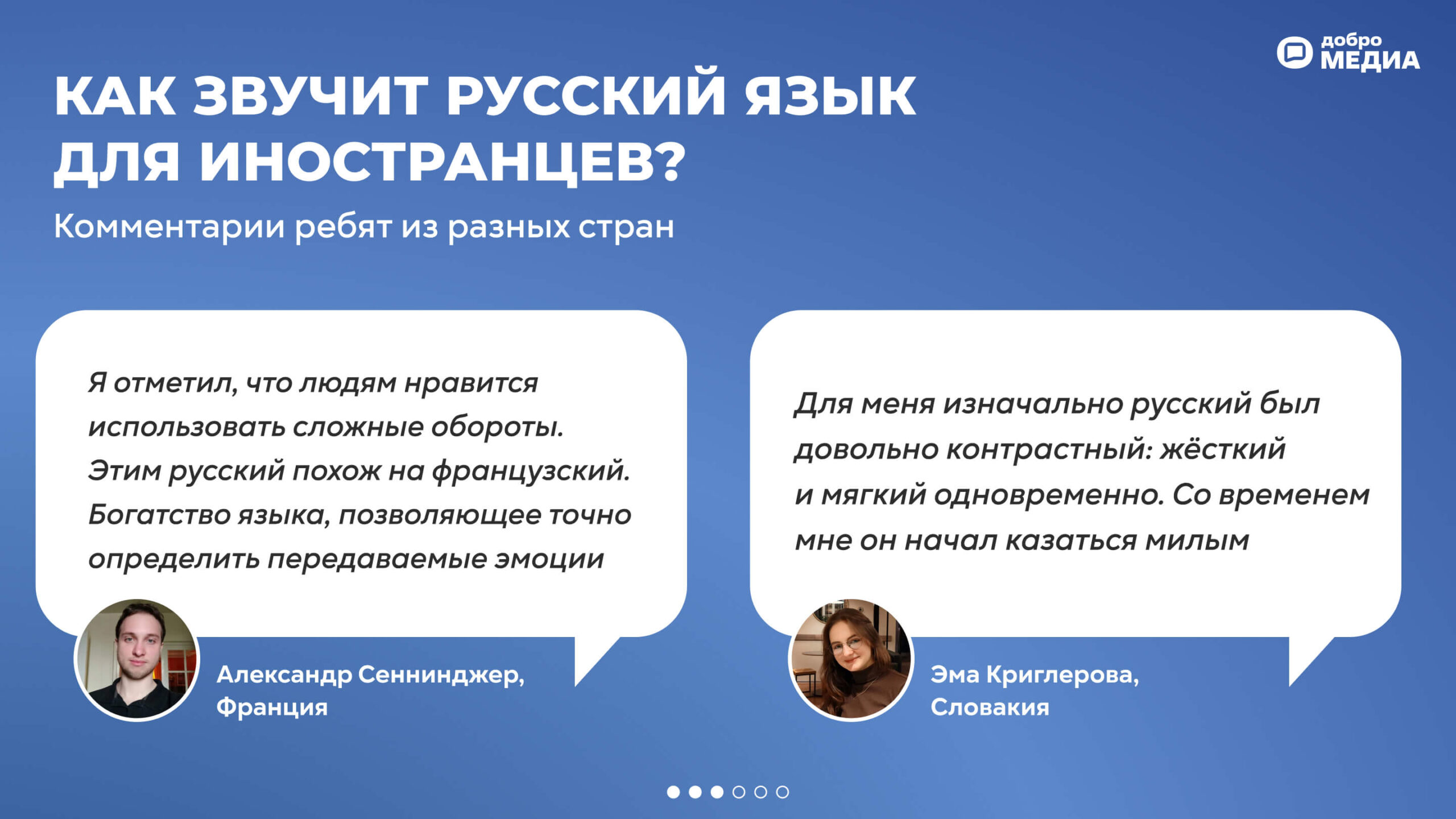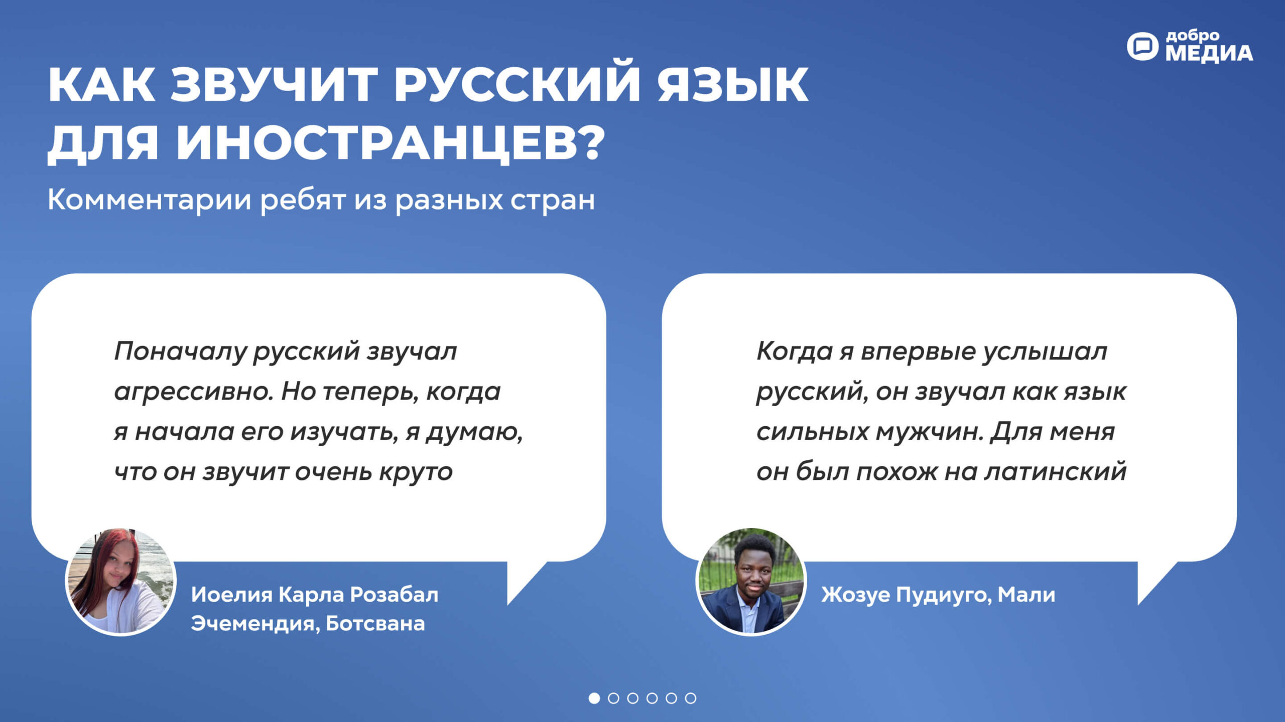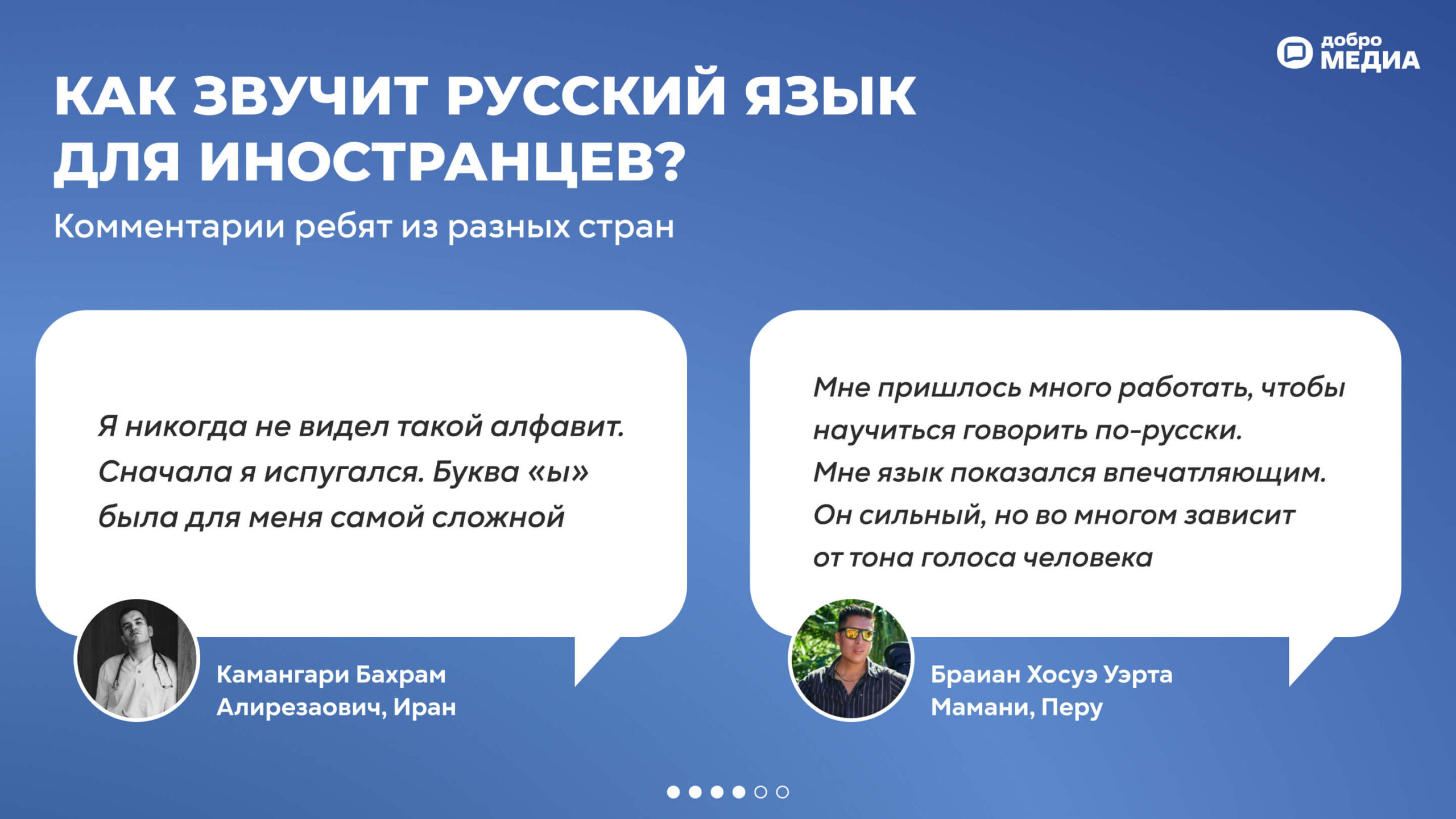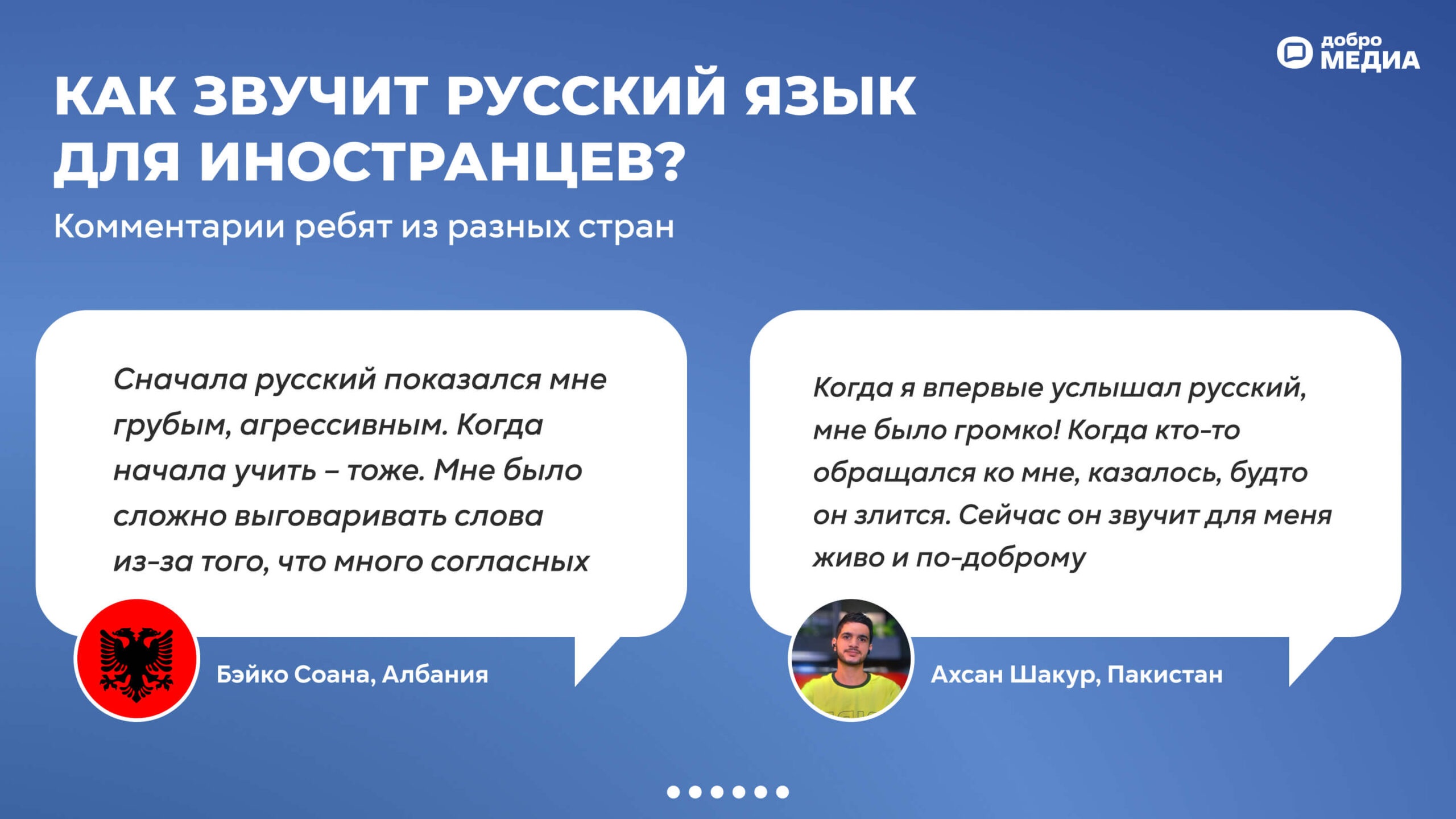 Для бразильца – монотонно, для албанки – мелодично. Как звучит русский для иностранцев? Ребята из Франции, Перу, Ботсваны, Словакии и других государств рассказали, как они воспринимают нашу речь. А лингвист и преподаватель Елизавета Дмитриева объяснила, с какими трудностями сталкиваются студенты при изучении великого и могучего.