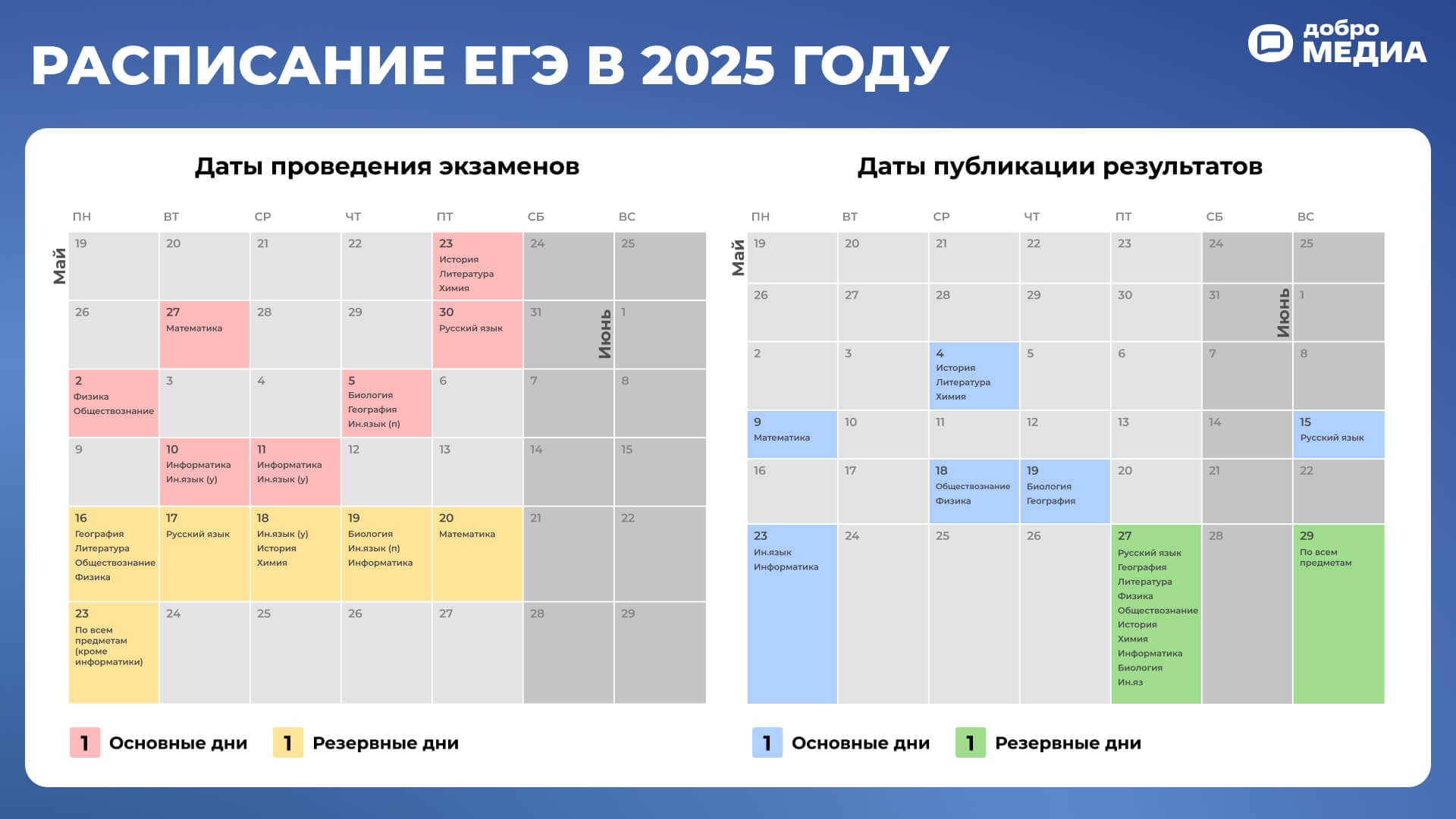 Основной период ЕГЭ в 2025 году продлится с 23 мая по 11 июня. Резервные дни для сдачи экзаменов предусмотрены с 16 по 23 июня.
