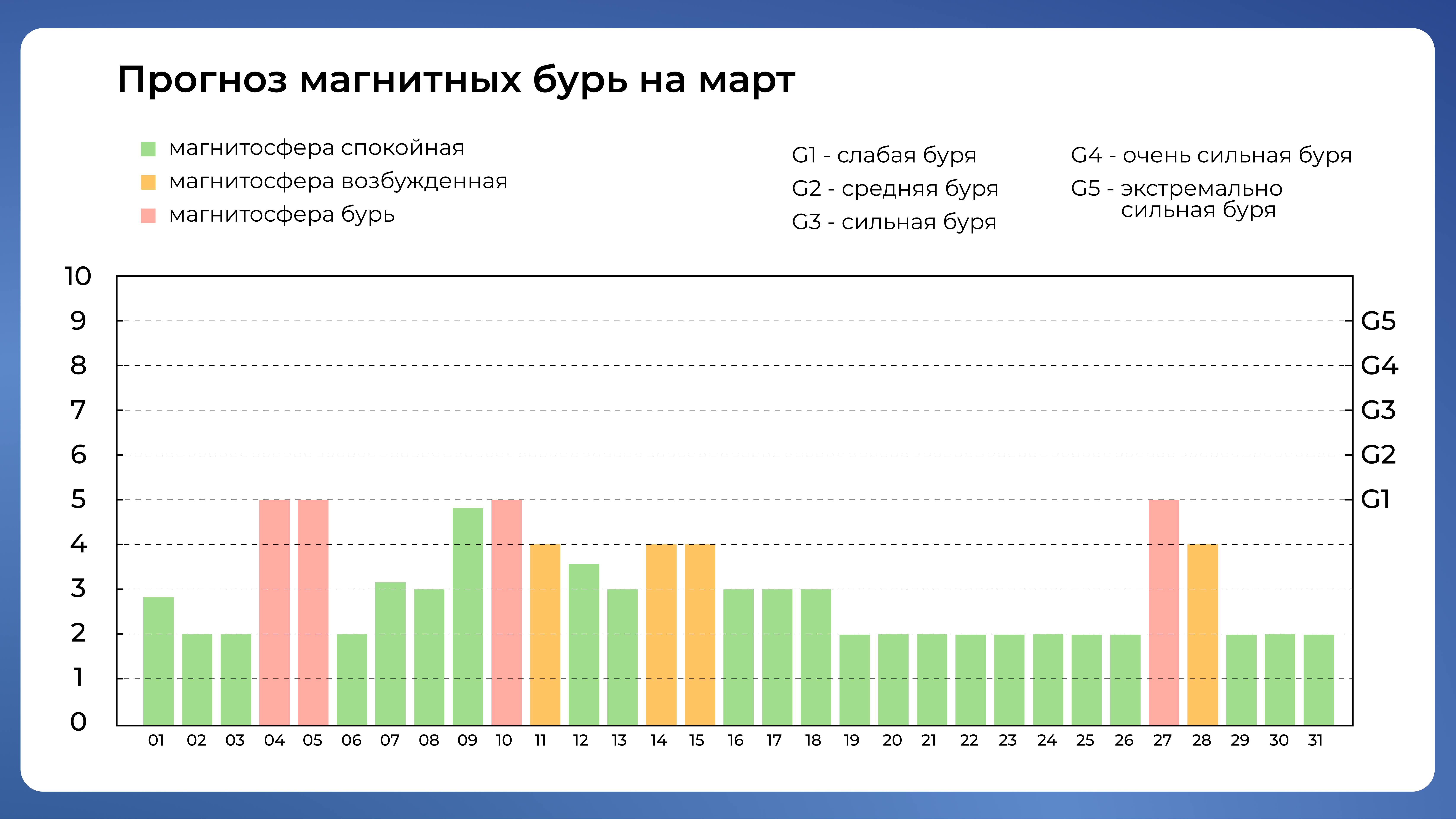 Календарь магнитных бурь на март 2025 года. Данные от 10 марта