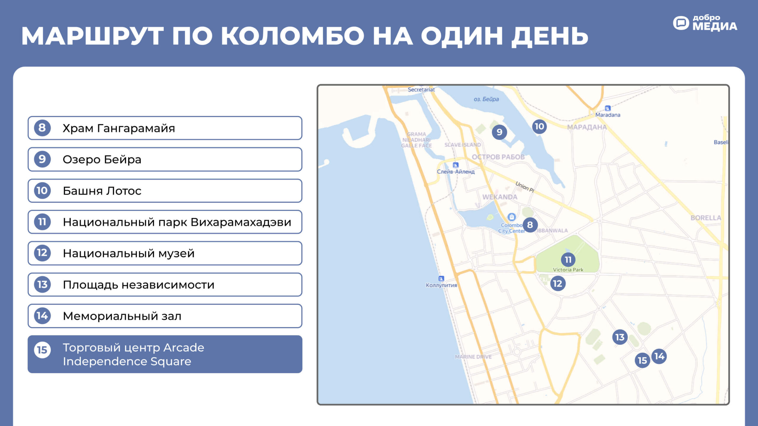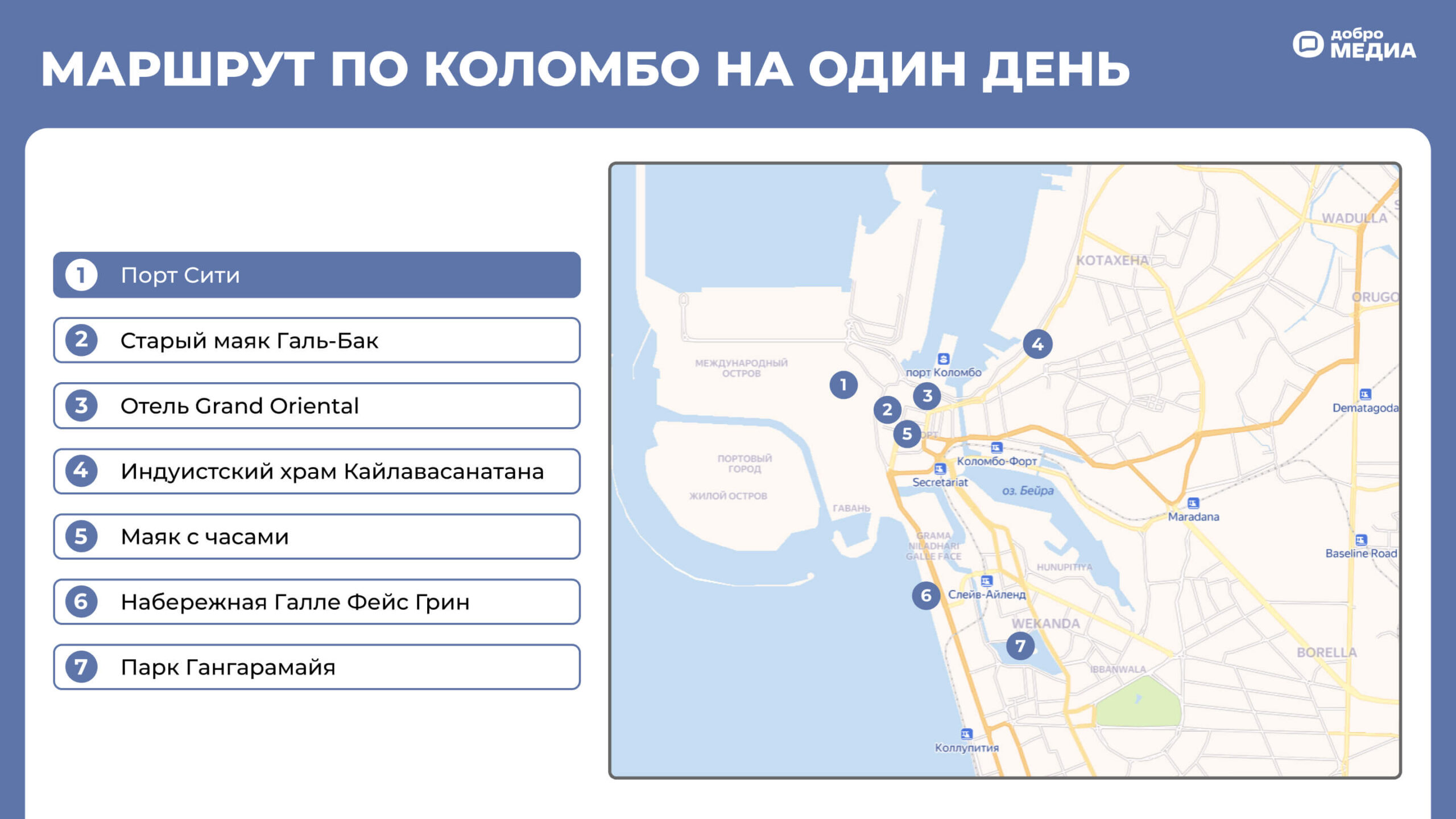 Маршрут по Коломбо на один день. Порт Сити (Port City) – Старый маяк Галь-Бак (Colombo Galbokka Lighthouse) – отель Grand Oriental – индуистский храм Кайлавасанатана (Sri Kailawasanatan Swami Temple) – Маяк с часами (Colombo Fort Old Clock Tower) – набережная Галле Фейс Грин (Galle Face Green) – парк Гангарамайя (Gangaramaya Park) – храм Гангарамайя (Gangaramaya Temple) – озеро Бейра (Beira Lake) – Башня Лотос (Colombo Lotus Tower) – Национальный парк Вихарамахадэви (Viharamahadevi Park) – Национальный музей (Colombo National Museum) – Площадь независимости (Independence Square) – Мемориальный зал (Sirimavo Bandaranaike Memorial Exhibition Centre) – торговый центр Arcade Independence Square.