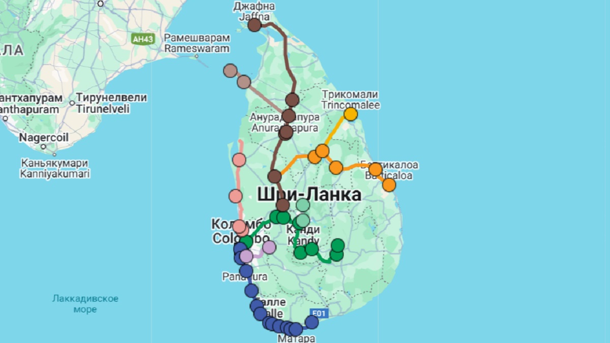 В любую часть острова можно доехать на поезде из Коломбо со станции Colombo Fort. Если вы едете из одного региона в другой, то, скорее всего, придётся сделать пересадку в неофициальной столице. Для удобства лучше ориентироваться на карту железнодорожных путей острова.