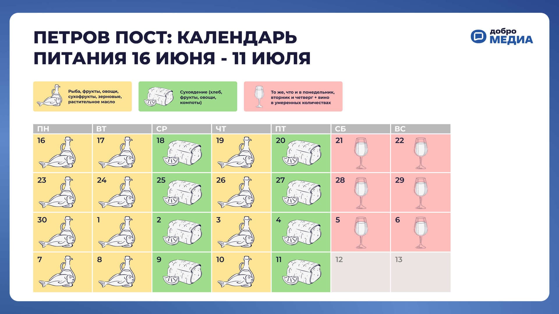 Редакция Добро.Медиа подготовила календарь Петрова поста. Сохраните, чтобы ничего не забыть.