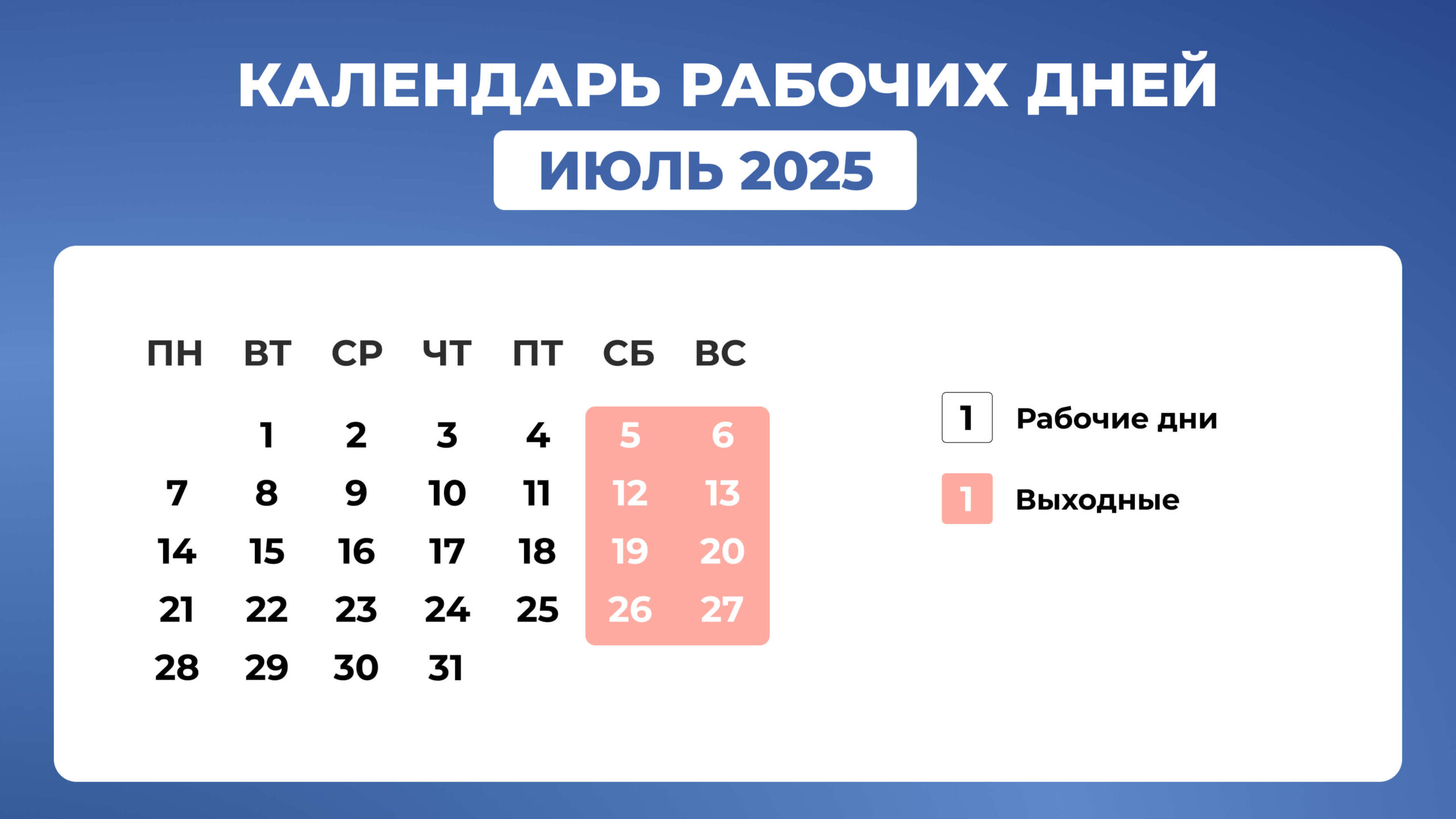 Производственный календарь на июль 2025 года – праздники, рабочие и выходные дни. Графика: Добро.Медиа