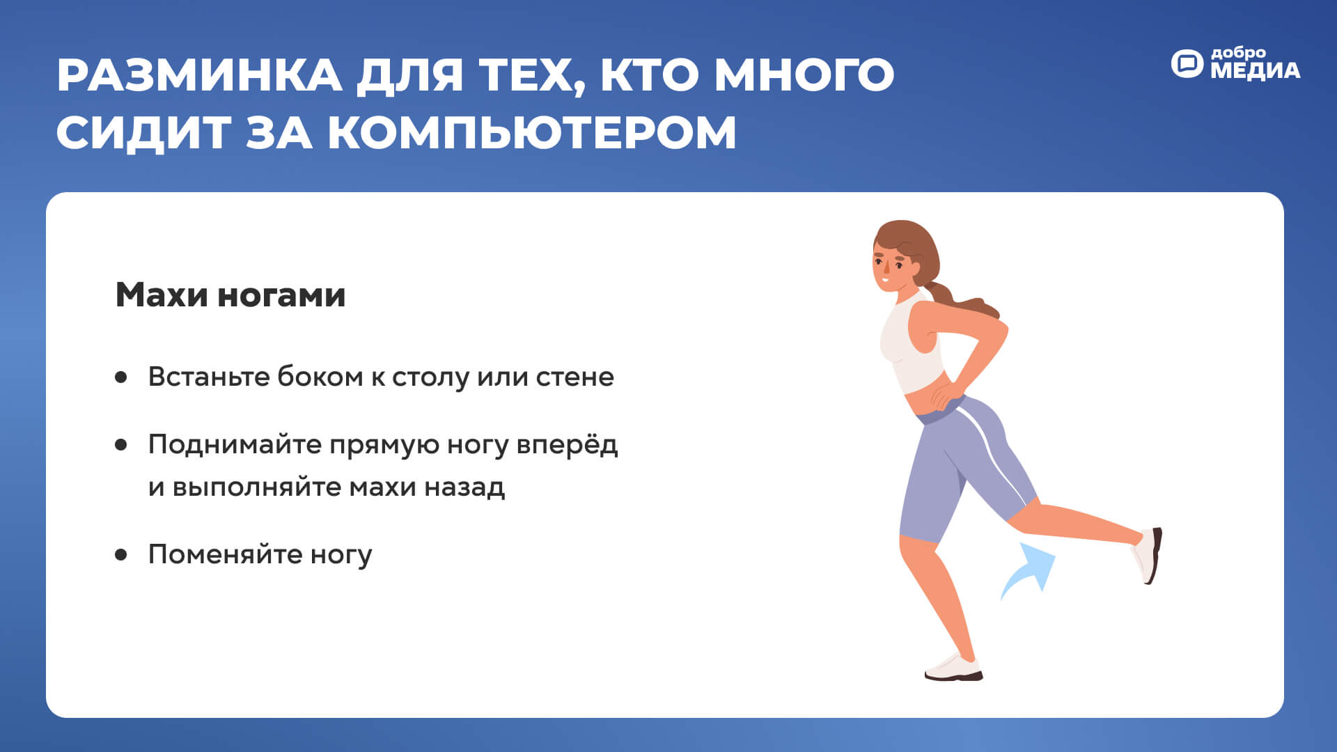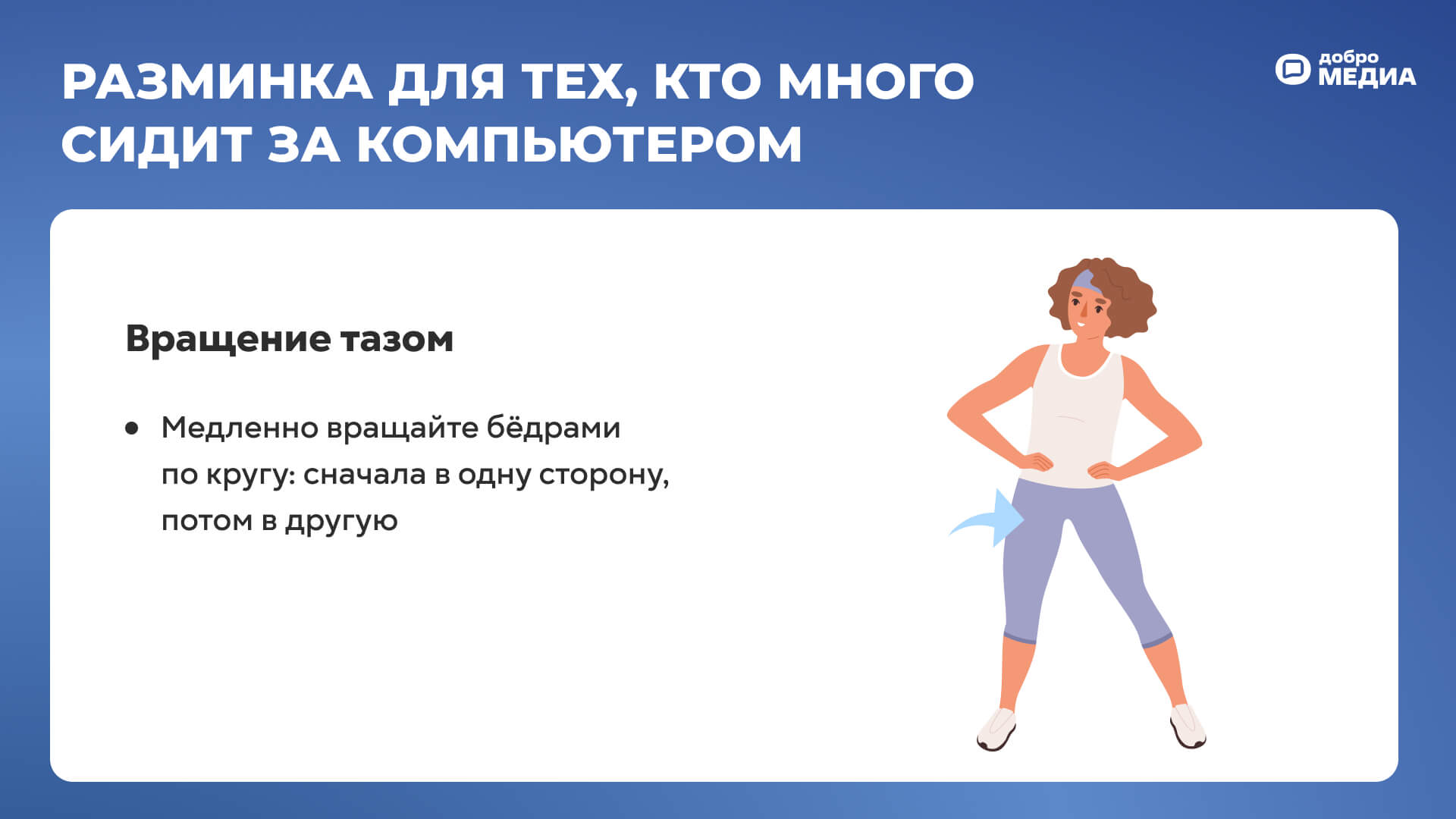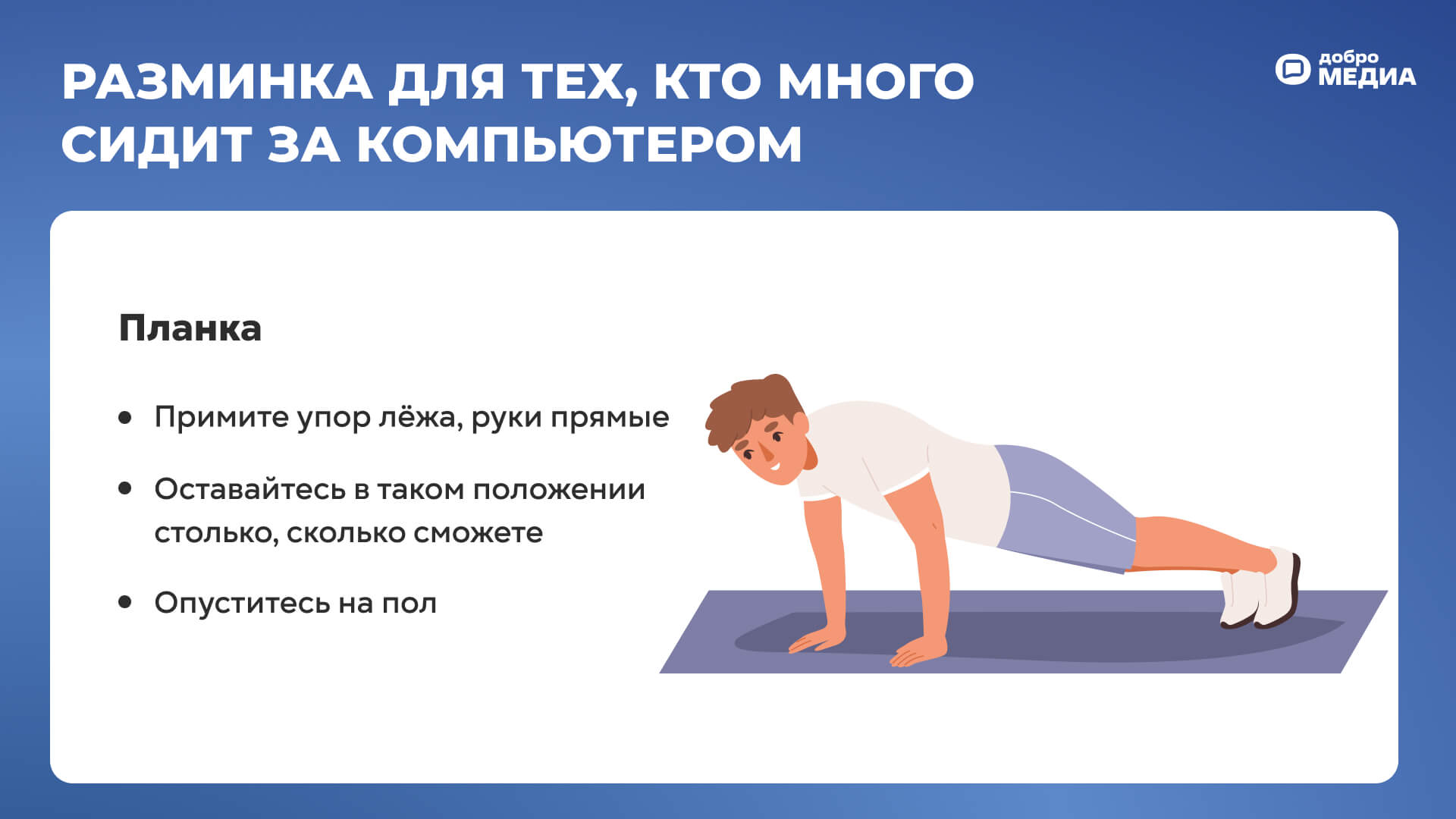 Всем удалёнщикам и офисным работникам необходимо делать перерывы между задачами. В свободные пять-десять минут вы успеете размяться.