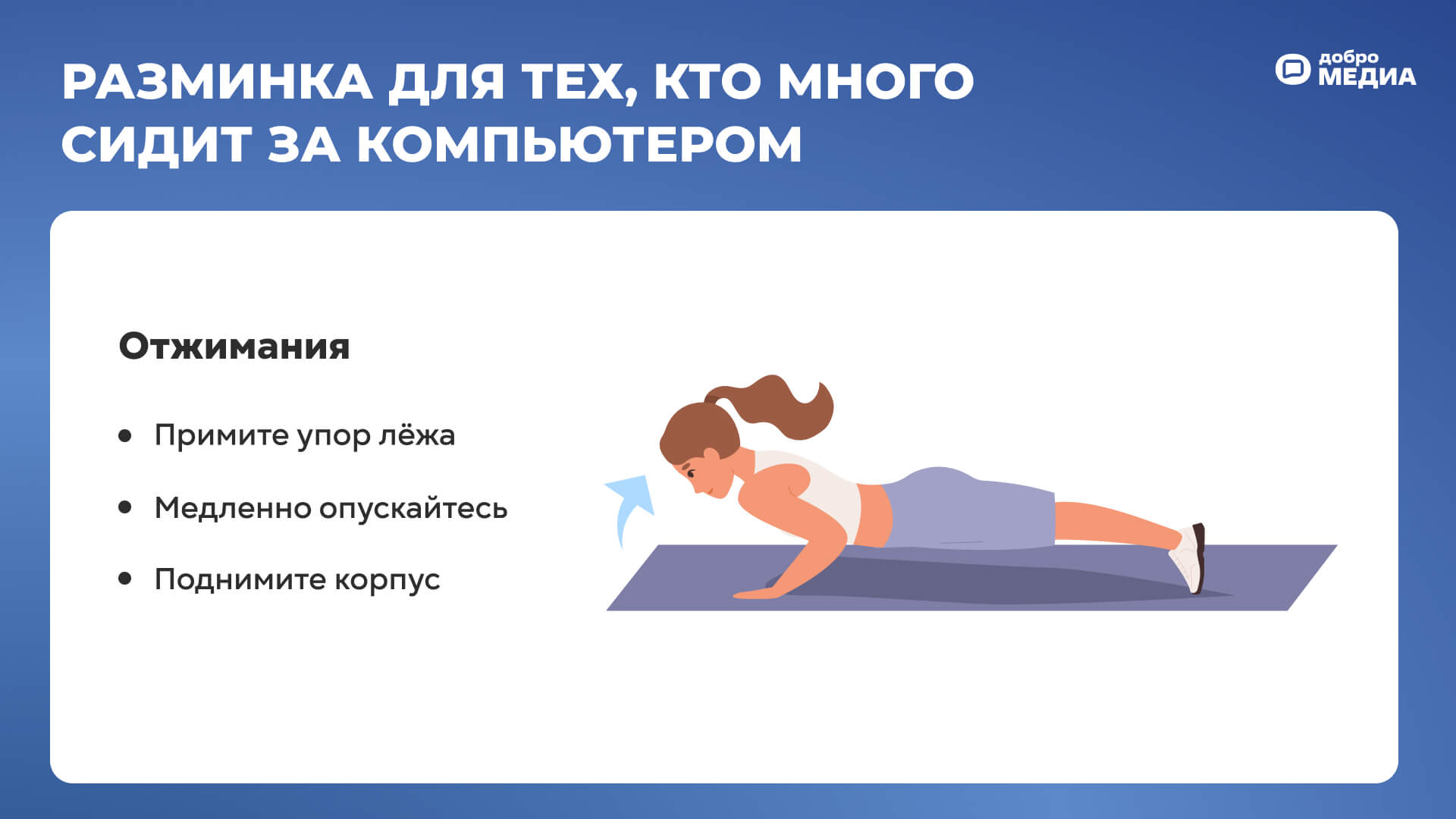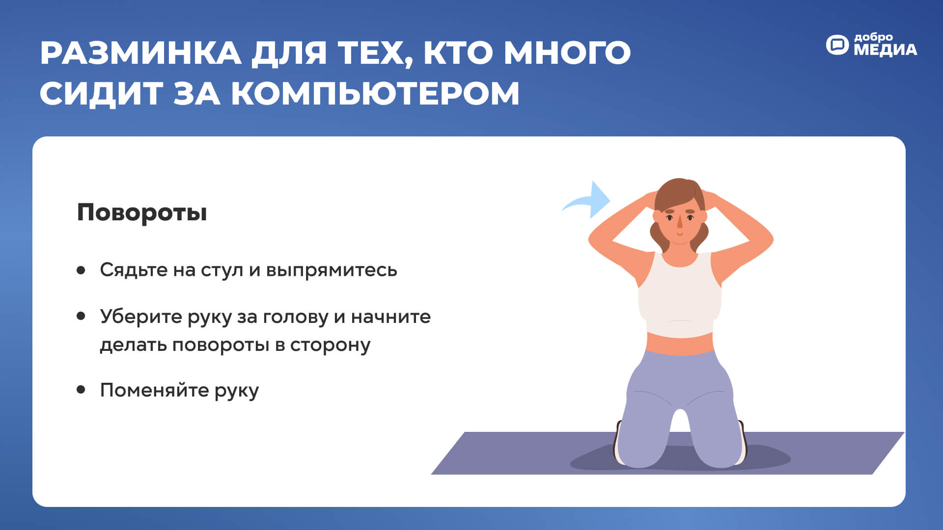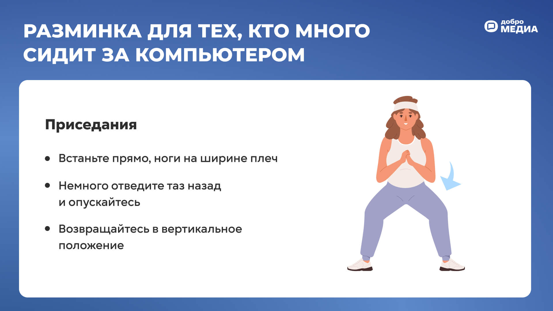 Всем удалёнщикам и офисным работникам необходимо делать перерывы между задачами. В свободные пять-десять минут вы успеете размяться.
