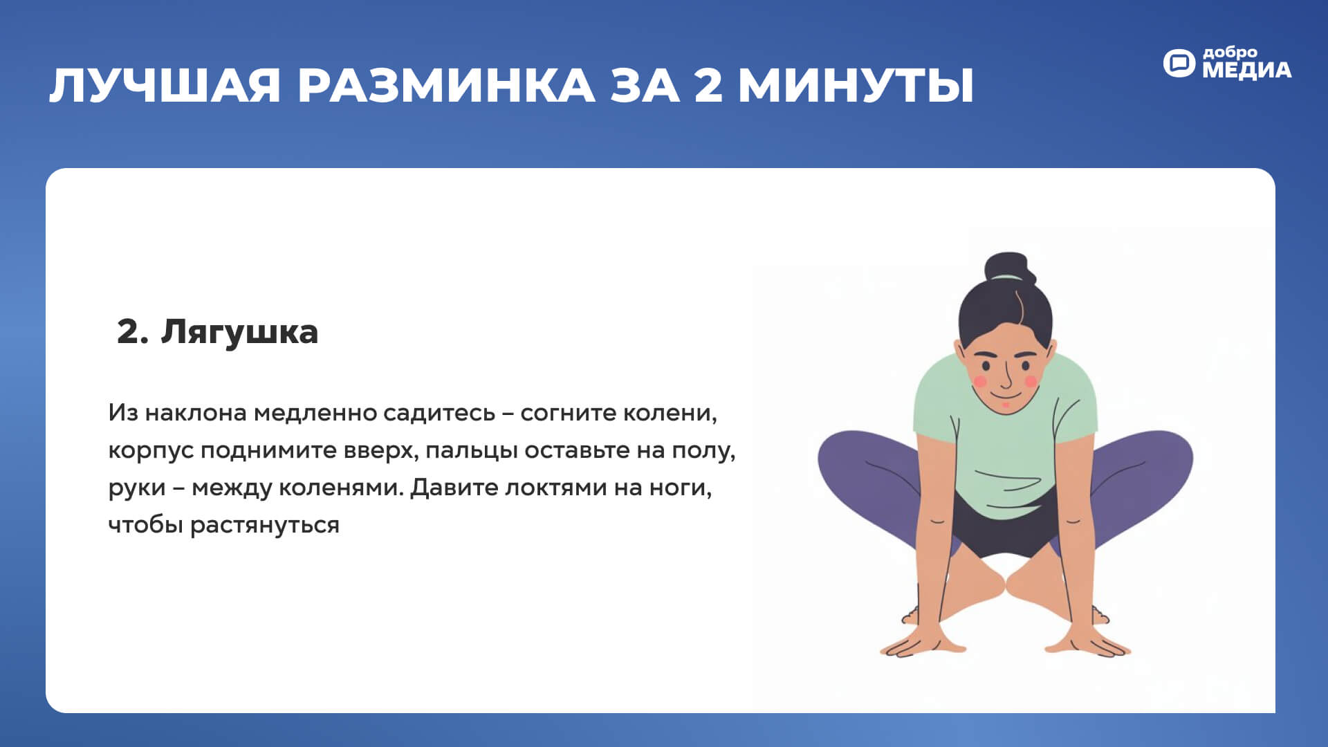 Лягушка. Из наклона медленно садитесь – согните колени, корпус поднимите вверх, пальцы оставьте на полу, руки – между коленями. Давите локтями на ноги, чтобы растянуться.