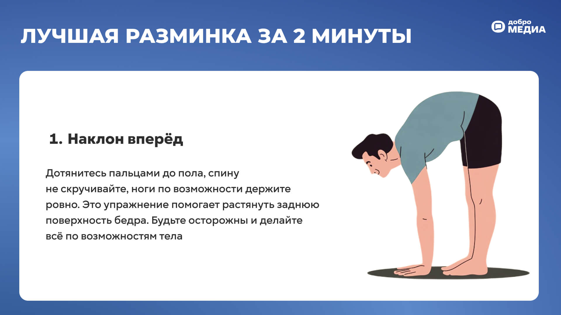 Наклон вперёд. Дотянитесь пальцами до пола, спину не скручивайте, ноги по возможности держите ровно. Это упражнение помогает растянуть заднюю поверхность бедра. Будьте осторожны и делайте всё по возможностям тела.