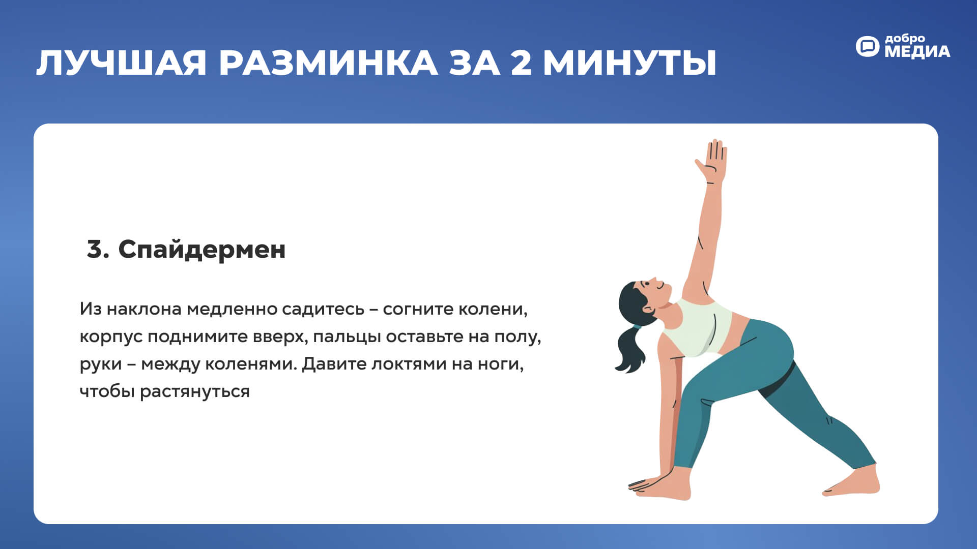 «Комплекс задействует практически все группы мышц, хорошо растягивает. Для разминки отлично подходит. Но перед этой гимнастикой нужно обязательно разогреться, – предупредил фитнес-эксперт. – Я рекомендую сначала сделать суставную разминку тазобедренных суставов, поясничного отдела, плечевого пояса. Только потом приступать к этой разминке. Ведь что главное при занятиях спортом? Обойтись без травм».