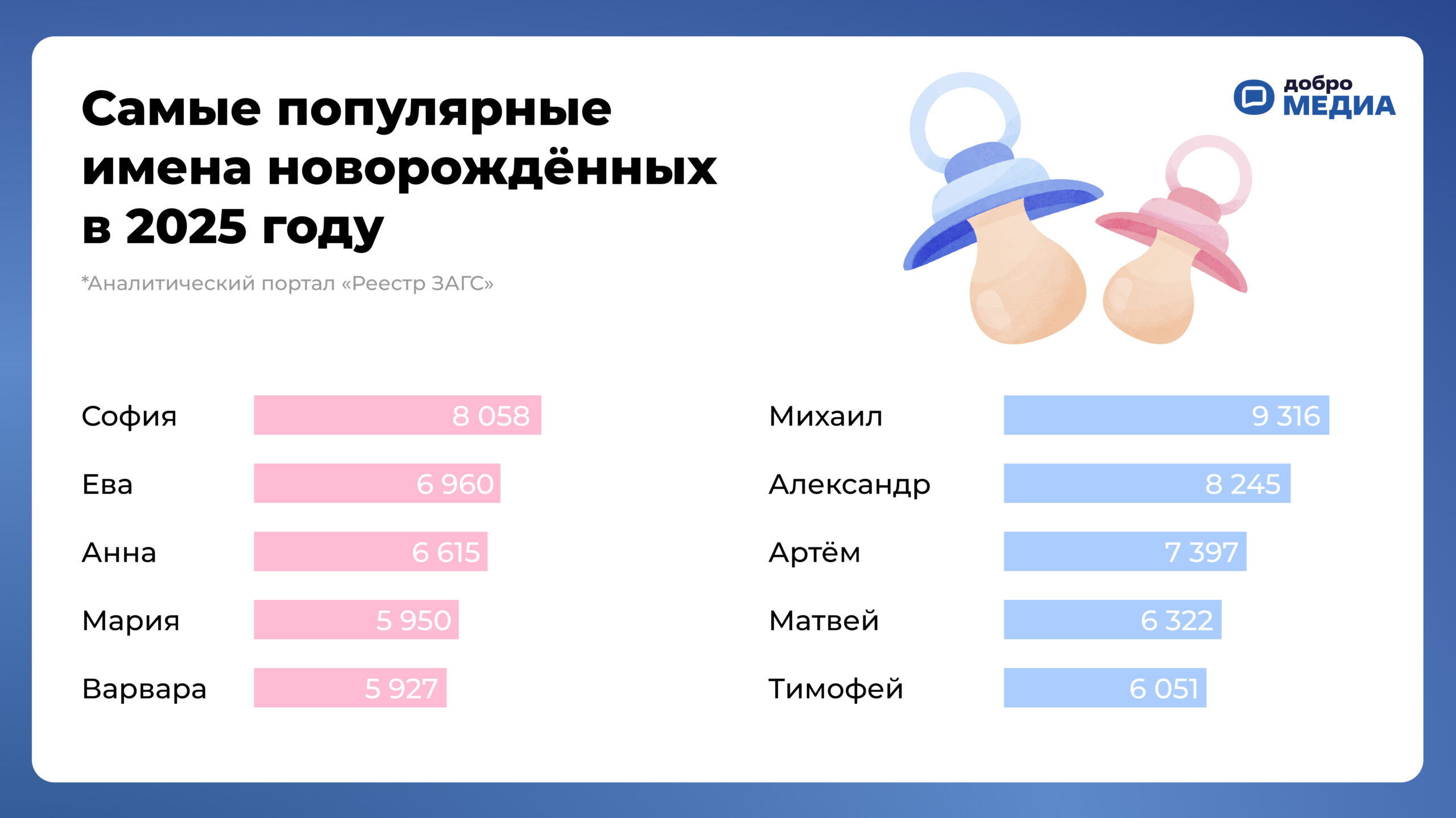 В 2025-м девочек чаще всего называли София. Это имя с 1 января получили 8 058 новорождённых. На втором месте по популярности – Ева (6960 детей), а на третьем – Анна (6615 человек). Замыкают пятёрку Мария (5 940) и Варвара (5 927).