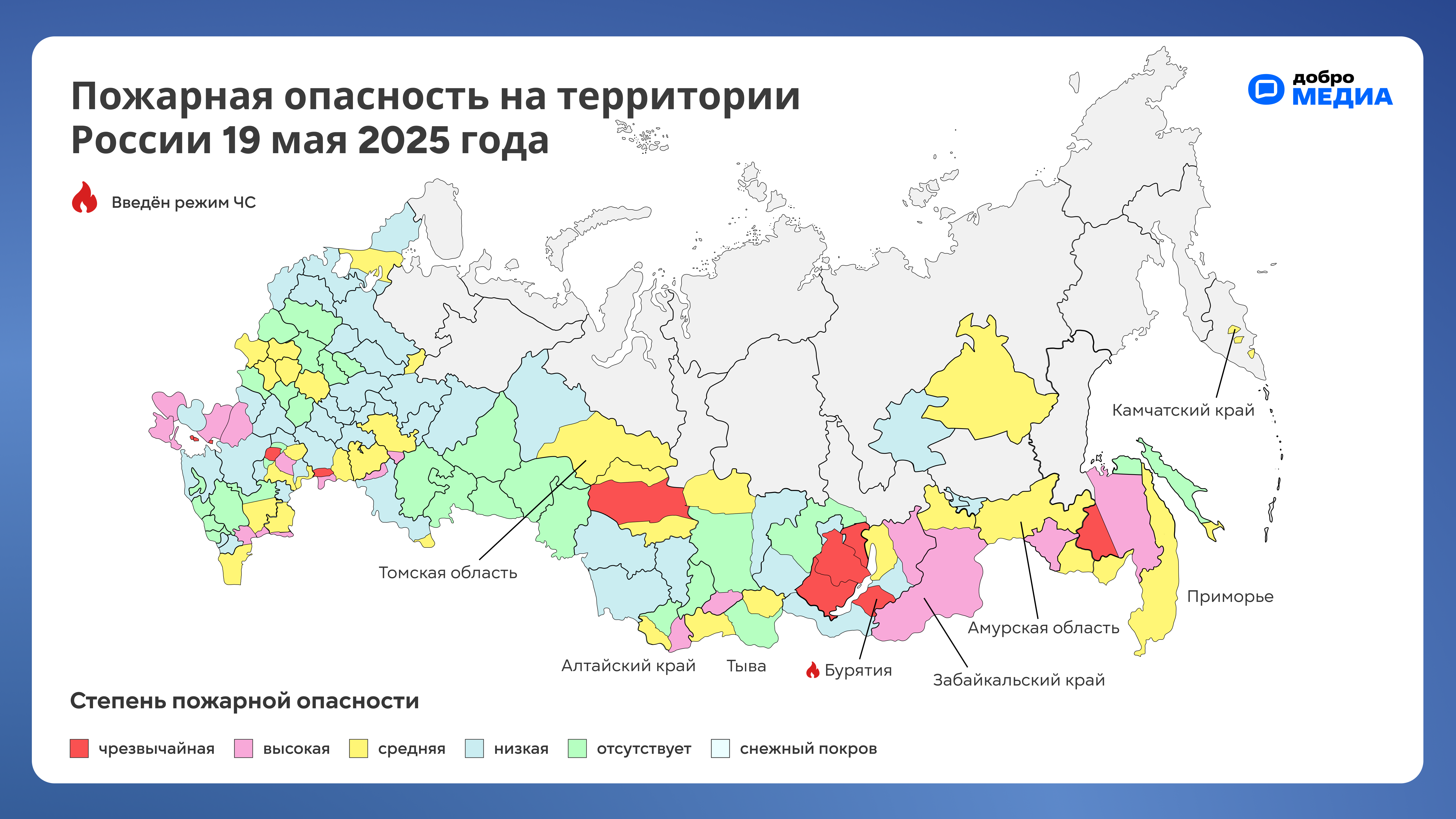 Зоны с подтверждёнными пожарами. Данные от 19 мая. Графика: Добро.Медиа