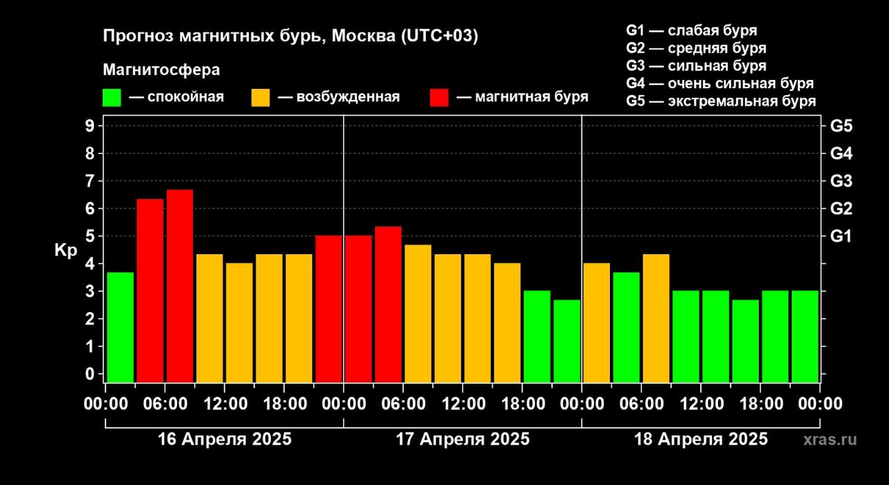 При таком уровне колебаний в средних широтах России может появиться полярное сияние. Однако в среду, 16 апреля, геомагнитные условия неблагоприятны для редкого явления.