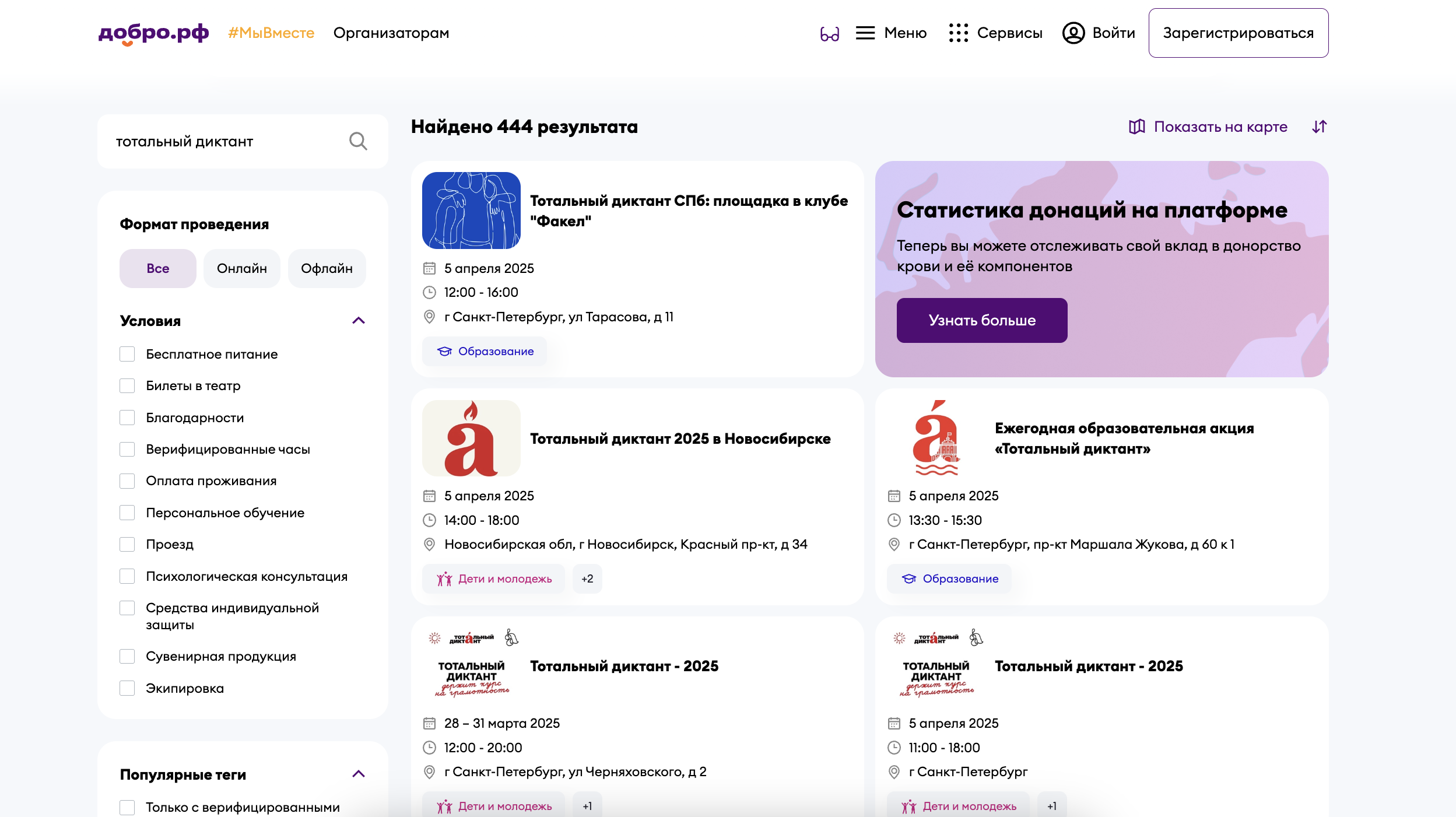 Стать волонтёром Тотального диктанта-2025 можно на Добро.рф. Скринштот: Добро.рф