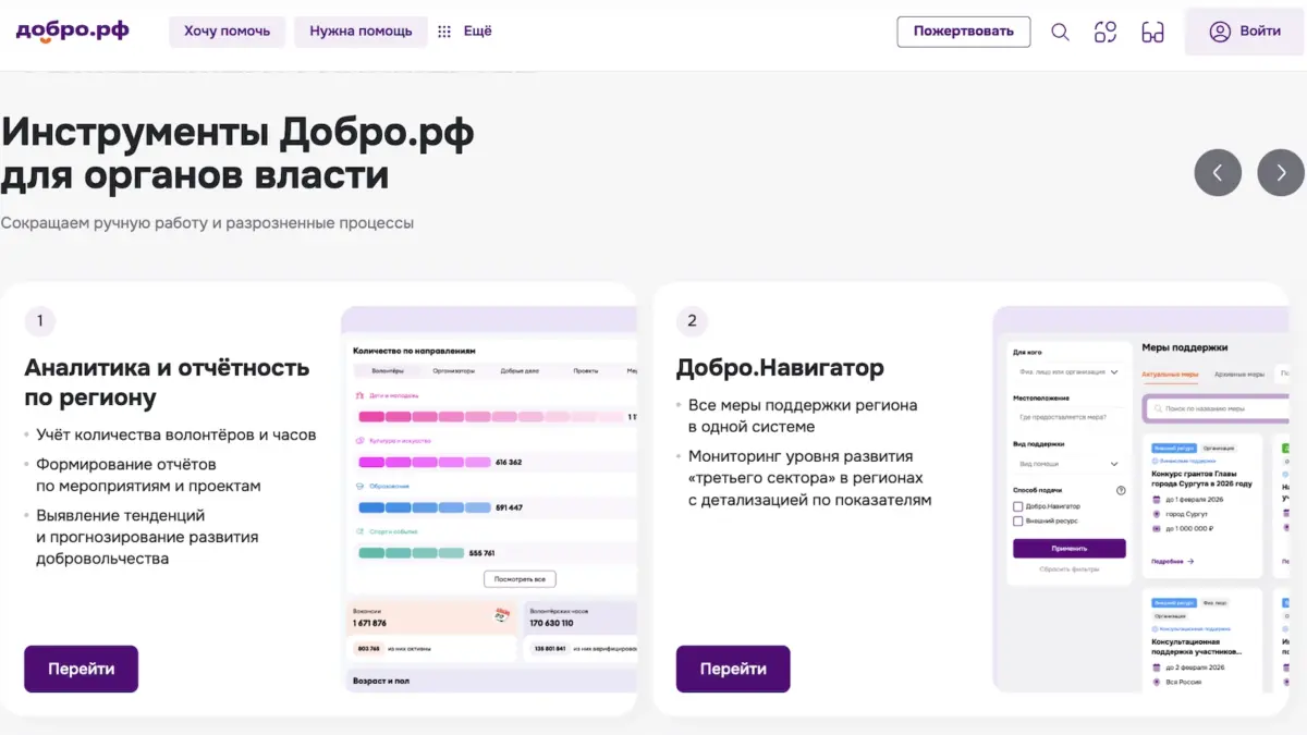 Одно из самых наглядных нововведений – единая витрина инициатив Ассоциации Добро.рф. Если раньше информацию распределяли по разным разделам и поддоменам, теперь её собрали в единый каталог. Все основные проекты получили подробное описание.