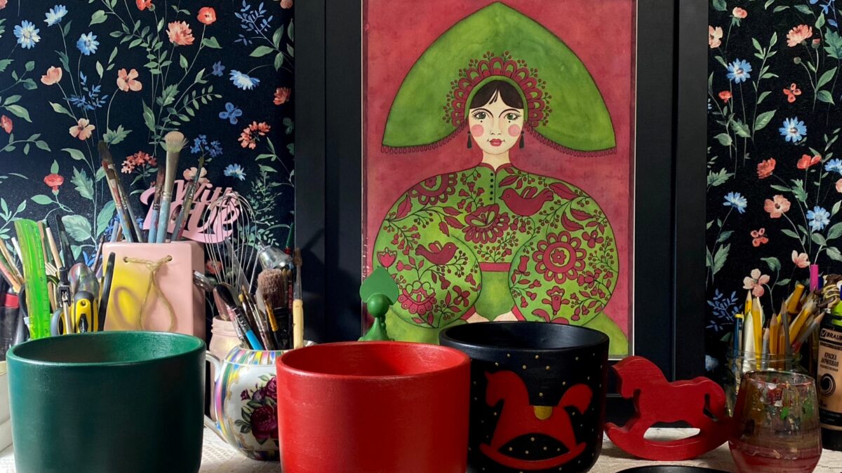 С тех пор художница создаёт работы в разных стилях. Долгое время она экспериментировала с техниками, не связанными напрямую с фольклором. Точечная роспись мандал, ботаническая акварель, графика, фактурная живопись. Но любовь к народным мотивам жила в ней всегда – достаточно было оглянуться на собственное детство и юность. В школе она танцевала русские народные танцы, а мама шила ей сарафаны и расшивала бисером головные уборы. В родительской кухне царила эстетика декоративно-прикладного искусства: большой жостовский поднос, хохломская посуда, расписные хлебницы и часы.