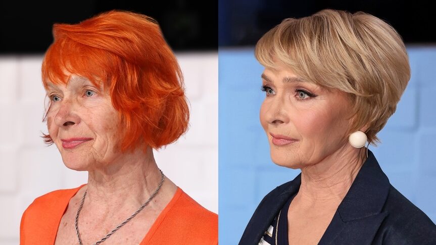 Буквально за несколько часов женщина с огненными волосами, в штанах и оранжевом пуловере стала эффектной блондинкой в брючном костюме. А ещё в юбке и укороченной кожаной курточке. Третий образ Тамары Ивановны дополнила шляпка с сеточкой.