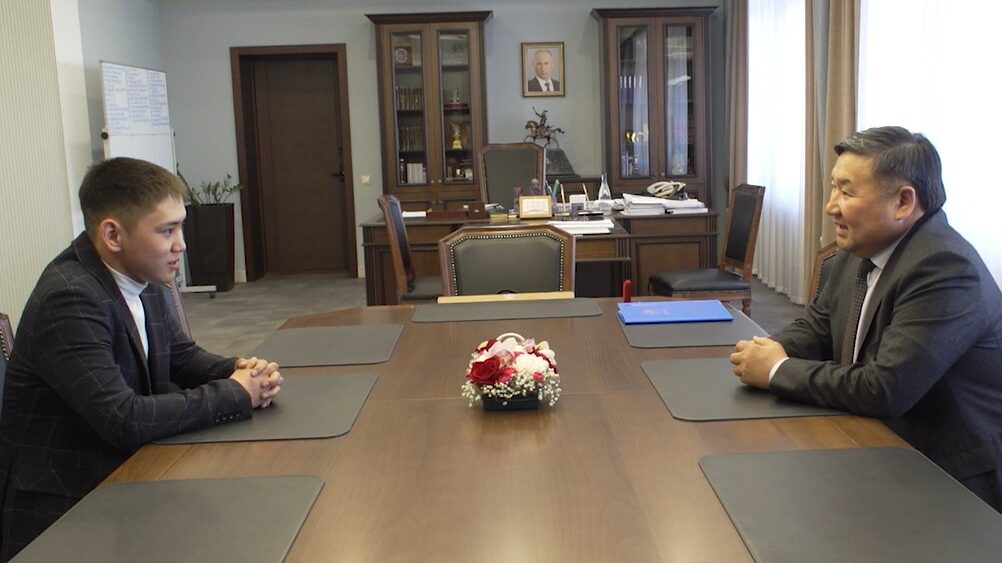 В тот же день губернатор пригласил Менги для награждения. Помимо грамоты вручили и ноутбук, чтобы парень готовился к поступлению в вуз. А лацкан его клетчатого пиджака теперь украшает знак с гербом Тувы.