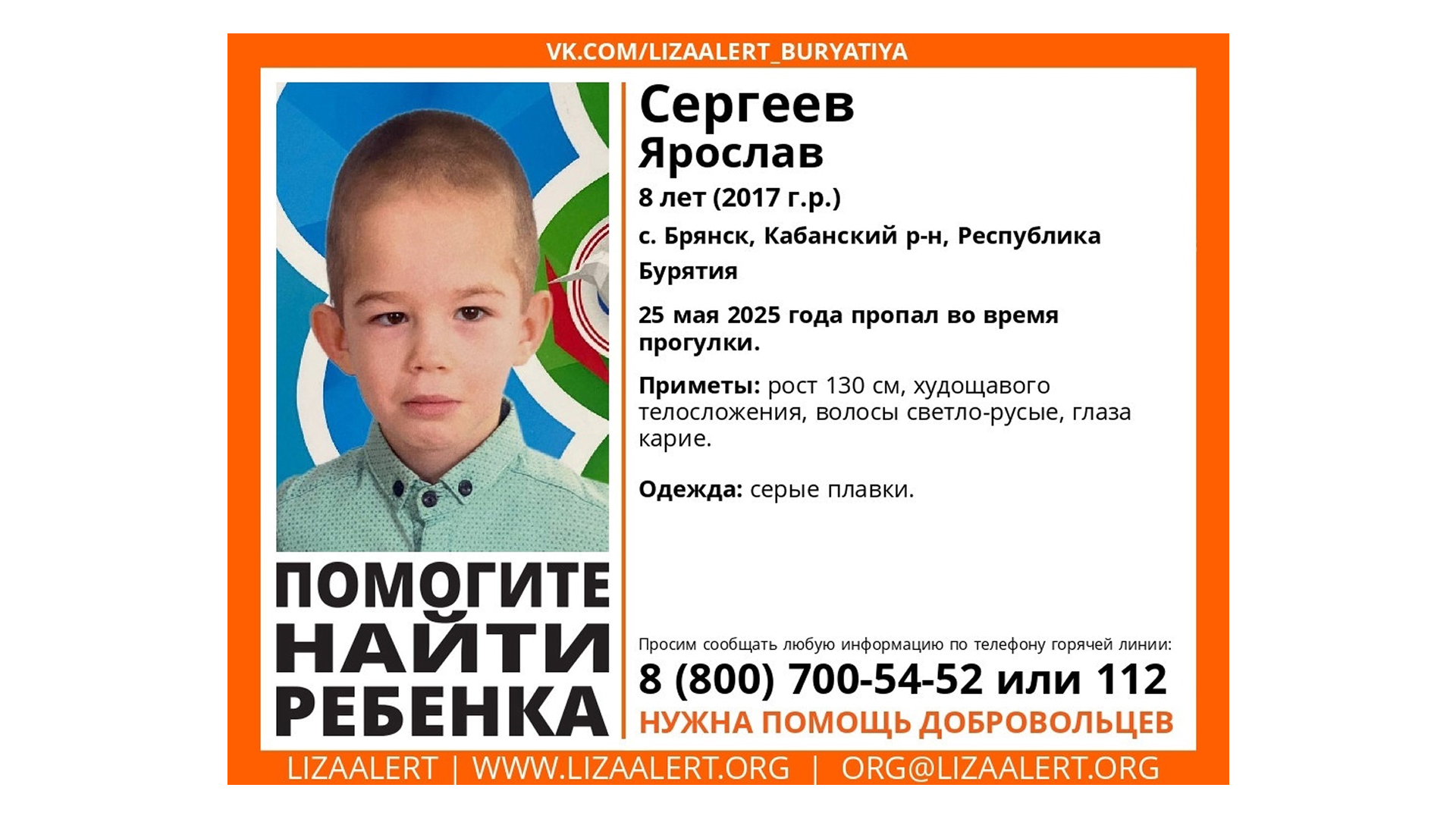 Если вы знаете о местонахождении ребёнка, позвоните по номеру телефона, указанному на этой листовке. Фото: сообщество VK «Поисковый отряд "ЛизаАлерт" Республики Бурятия»