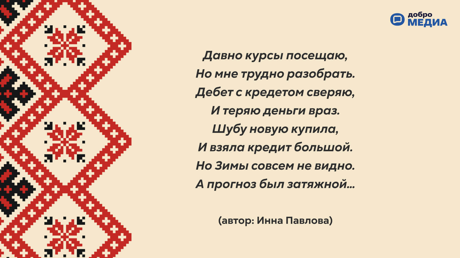 В январе, чтобы заинтересовать как можно больше людей, Козлова вместе с командой объявила конкурс «частушек и вредных советов» на тему финансовой грамотности. И люди откликнулись на их предложение.